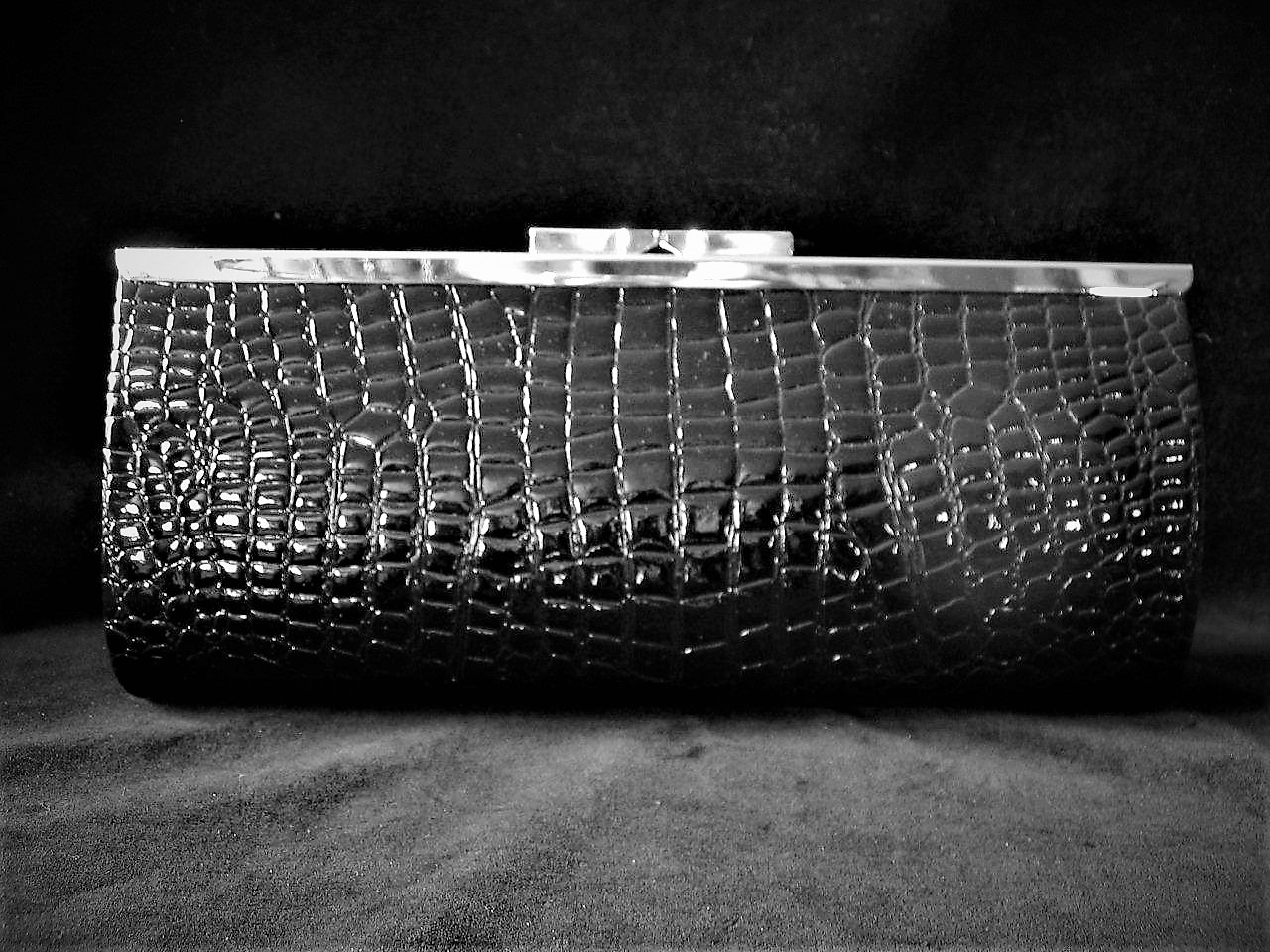 Croc stamped pattern on glossy patent like finish with polished chrome hardware. Easy twist closure snaps shut for secure wear. Suitable for any occasion from day to evening looks. Simple timeless design that never dates and will take you season to season. Select colour choice.